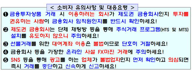 금감원은 위와 같은 경우 사실상 피해 회복이 불가능하다며 금융소비들의 각별한 주의를 당부했다. 우선 금융투자상품 거래 시 이용하려는 회사가 제도권 금융회사인지, 투자를 권유하는 사람이 금융회사 임직원인지 여부를 반드시 확인해야 한다. ‘A투자자문’, ‘B경제TV’, ‘C투자연구소’ 등의 명칭으로 투자 정보 및 리딩 등 자문 서비스 등을 제공하는 경우 제도권 금융회사 또는 유사투자자문업자인지를 확인할 필요가 있다. 금감원 금융소비자 정보포털 ‘파인’ 홈페이지에서 제도권 금융회사 및 유사투자자문업자 여부를 조회할 수 있다.
