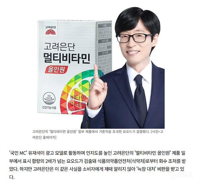 유재석 모델로 쓴 '고려은단 비타민', 요오드 초과로 회수조치 - 코메디닷컴