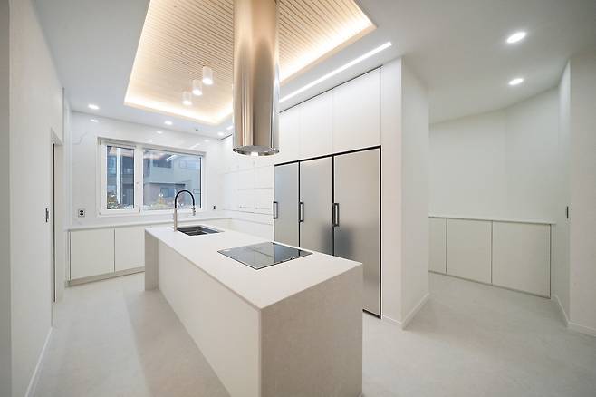 전면에 대형 박판타일을 적용해 고급스러움을 극대화했다. 2층의 스킵플로어 구조를 활용해 높이를 확보한 천장 덕분에 깔끔한 조명 배치는 물론 탁 트인 공간감을 선사한다.