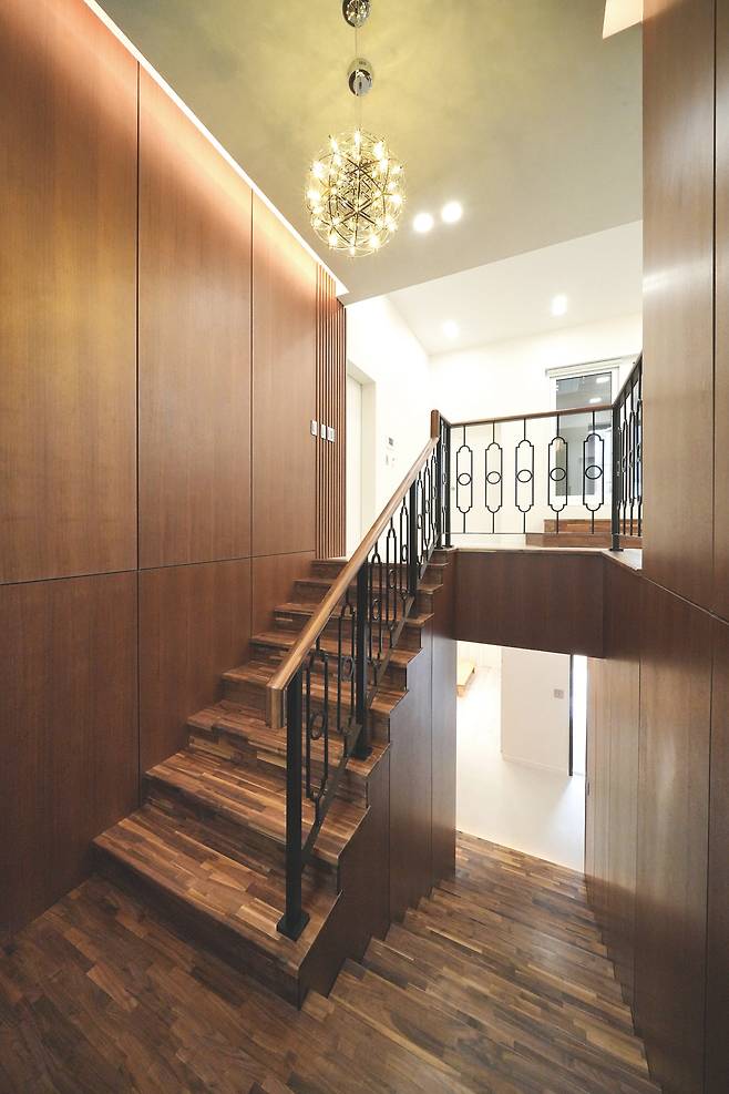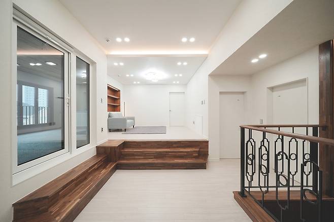 무늬목 소재가 주는 중후한 느낌이 돋보인다. 민판 무늬목의 단조로움을 줄이고자 계단 첫 단에는 간접조명과 자갈을 조합해 설치했다. 크기에 변화를 준 단차도 개성을 더한다.