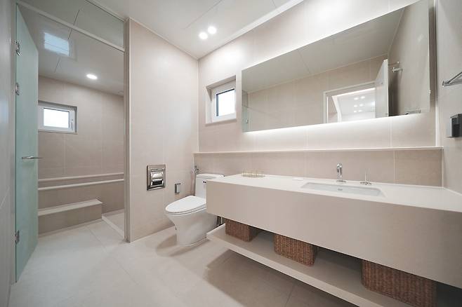 아이보리 톤 타일은 따뜻하고 일체형 세면대와 조명형 거울은 세련됐다. 건식 공간(세면대 겸 파우더룸)과 습식 공간(샤워실)을 벽으로 분리해 사용과 관리의 효율성을 높인 것이 특징이다.