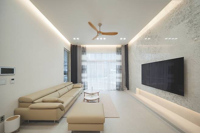 벽면은 화이트 톤, 바닥면은 그레이 톤으로 적용해 밝고 심플한 분위기로 조성했다. 수납장 하단에 설치된 간접조명이 따뜻하고 아늑한 공간감을 연출한다.