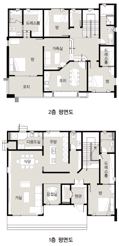 본 주택은 부지 네 면이 도로에 접해 프라이버시에 이점이 있다. 현관에서 주방으로 가는 동선은 동시에 복도에서도 순환할 수 있어 효율적이다. 2층에 넓게 확보한 가족실과 홀은 답답함을 해소한다. 특히, 스킵플로어 구조를 활용해 자연스럽게 분리하면서 연출한 공간감이 독특하다. 그 옆에 가족이나 지인 등 많은 인원을 수용해 다양하게 활동할 수 있는 포치도 눈에 띈다.