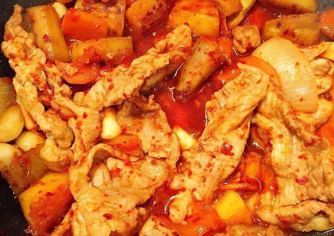 2️⃣ 매콤한 제육볶음 – 고지방 & 혈당 상승 콤보 🥩