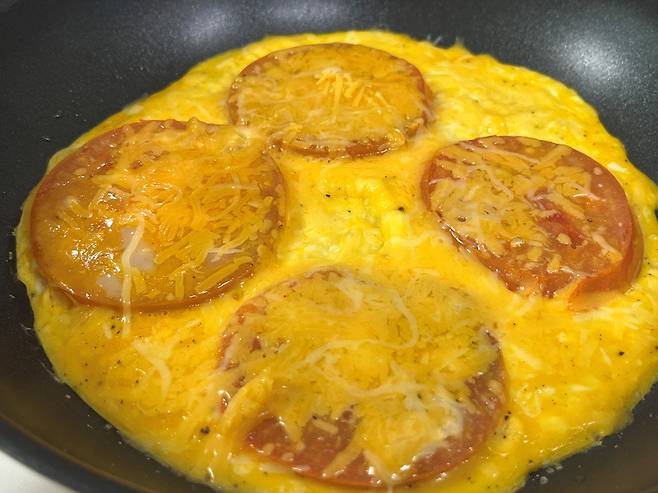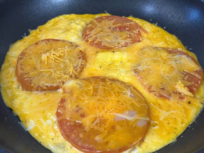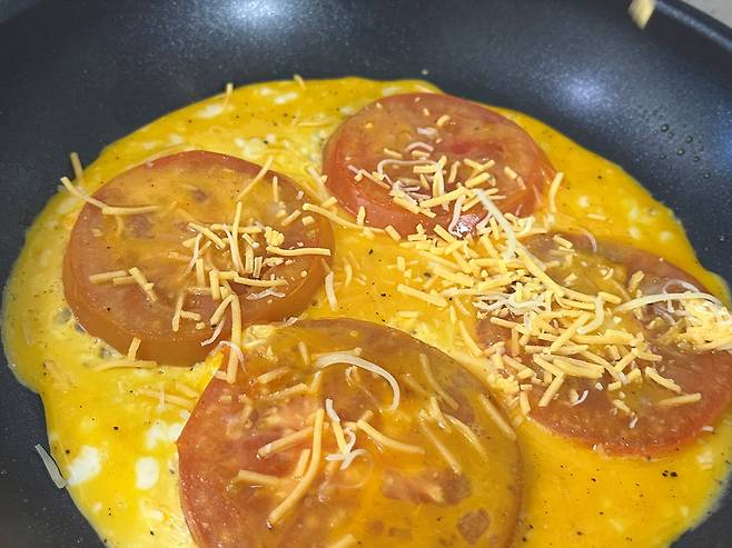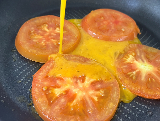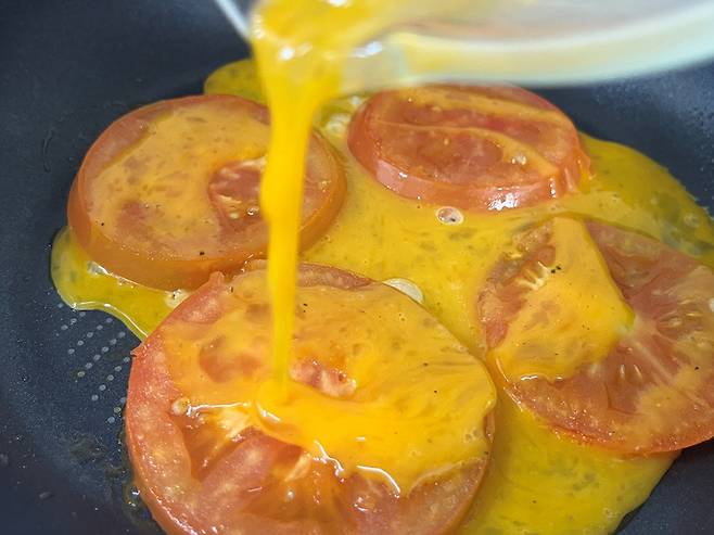 토마토가 익으면 뒤집어 주고 그 위에 계란 푼 것을 부어 줍니다. 토마토에 계란의 단백질과 지방이 더해지면, 포도당 흡수가 완만해져 식후 혈당이 급격히 오르지 않습니다.