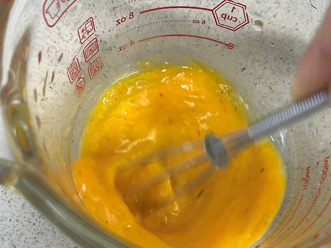 계란 1~2개를 풀고 소량의 소금, 후추로 밑간을 합니다. 간식이나 아침 식사로 드시는 경우 계란 1개, 식사로 드시는 경우 계란 2개를 쓰시면 됩니다.