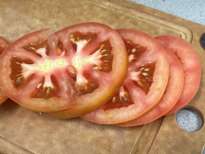 토마토는 눕힌 상태에서 약 1cm 두께로 썰어 두세요. 여기에 양파, 파프리카 등 다른 야채를 넣어도 되지만 토마토 본연의 맛을 즐기고 싶다면 토마토만 넣으세요.