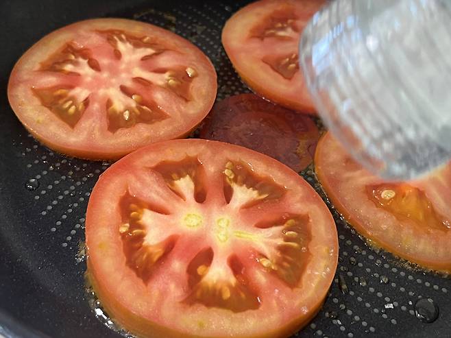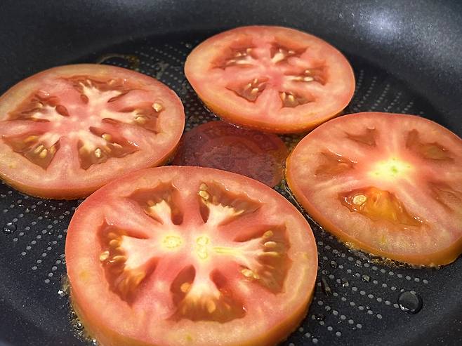 팬에 올리브오일이나 아보카도오일을 두르고 토마토를 약불에서 은근히 구워줍니다. 이렇게 하면 토마토의 수분이 자연스럽게 날아가면서 단맛이 깊어지고, 동시에 항산화 성분의 체내 흡수율이 높아집니다.