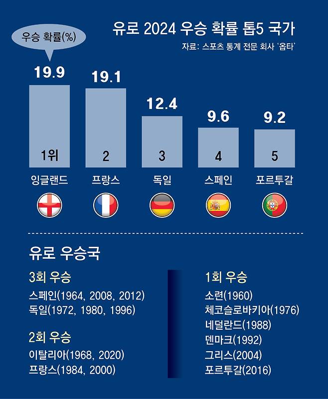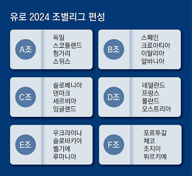 ‘유로 2024’가 15일 개최국 독일과 스코틀랜드의 개막전을 시작으로 결승전이 열리는 7월 15일까지 한 달간 열전에 들어갔다. 24개국이 참가해 4개 팀씩 6개 조로 나뉘어 조별리그를 치른다. 각 조 1, 2위와 3위 중 성적이 좋은 4개 팀이 토너먼트 라운드인 16강에 오른다. 4년에 한 번 열리는 유로는 ‘미니 월드컵’ ‘브라질, 아르헨티나가 빠진 월드컵’으로도 불린다.
