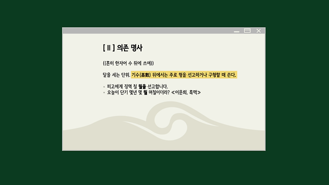일단 표준국어대사전에 따르면 기수(基數) 뒤에서는 주로 형을 선고하거나 구형할 때 쓰는 의존명사로 '월(月)'이 등재되어 있습니다.