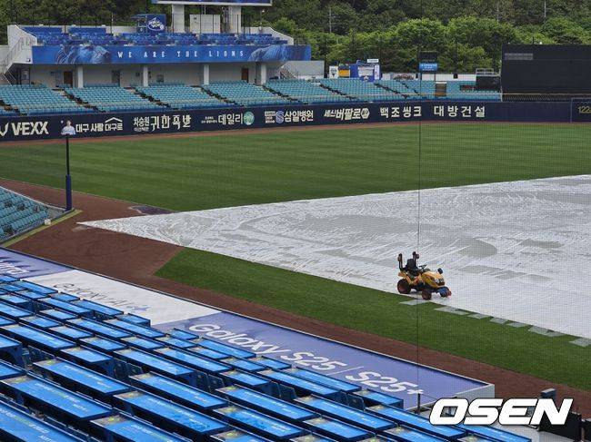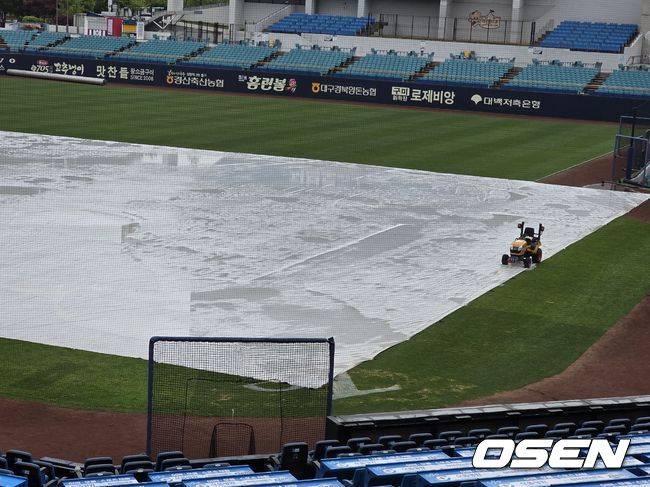 이날 오전부터 비가 내리며 그라운드를 촉촉하게 적시고 있다. 오후 1시 45분 현재 내야에 덮인 대형 방수포 위로 비가 고여 있다. 현재 약한 비가 내리고 있으며 기상청 예보에 따르면 강수 확률은 60%다.