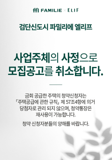 8일 건설부동산업계에 따르면 신동아건설 컨소시엄이 분양을 진행하던 검단신도시 파밀리에 엘리프 모집이 취소됐다. 모집취소로 기존 청약자들은 청약통장 재사용이 가능하다.