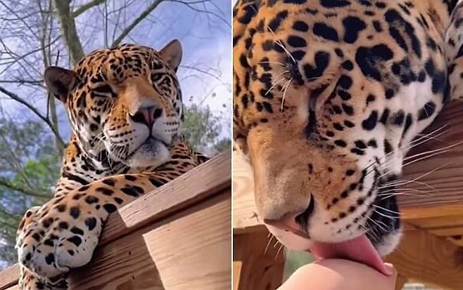 자신에게 손을 내민 여성을 위협할 줄 알았는데 재규어는 놀랍게도 여성의 손을 정성껏 핥아주는 것이 아니겠습니까. 마치 고양이라도 된 것 마냥 말입니다.