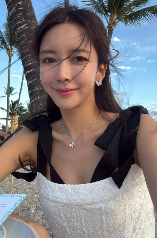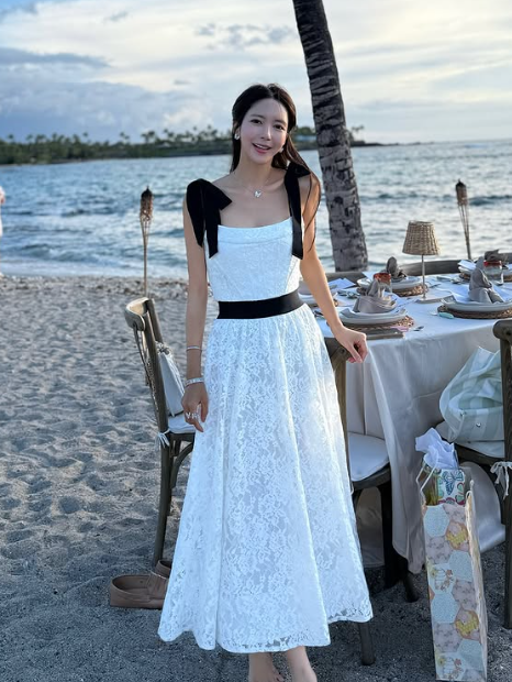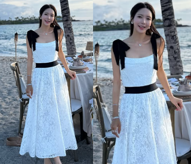 박현선은 최근 비치룩을 완성한 화이트 민소매 롱원피스를 착용하여 우아하면서도 여성스러운 분위기를 뽐냈습니다. 원피스의 민소매끈은 블랙 리본 스트랩으로 포인트를 주었고, 허리끈과 스커트의 레이스 디테일로 여성스러움을 강조했습니다.
