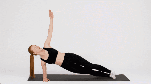 오른쪽 팔뚝을 바닥에 대고 옆으로 눕습니다. 엉덩이를 들어 올려 자세를 잡습니다. 왼손을 천장을 향해 공중으로 뻗습니다. 왼손을 내리면서 몸을 비틀어 바닥 쪽을 향하도록 합니다. 다시 원래 자세로 돌아옵니다. 이 동작을 반복한 후, 왼쪽 팔뚝을 대고 운동하세요.