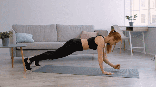 플랭크 기본자세를 취합니다. 한 손을 구부려 팔꿈치를 바닥에 대고, 다른 손도 구부려 팔꿈치 플랭크 자세를 만듭니다. 다시 한 손씩 펴서 원래 손바닥 플랭크 자세로 돌아옵니다. 이 동작을 반복하며 자세를 유지합니다.