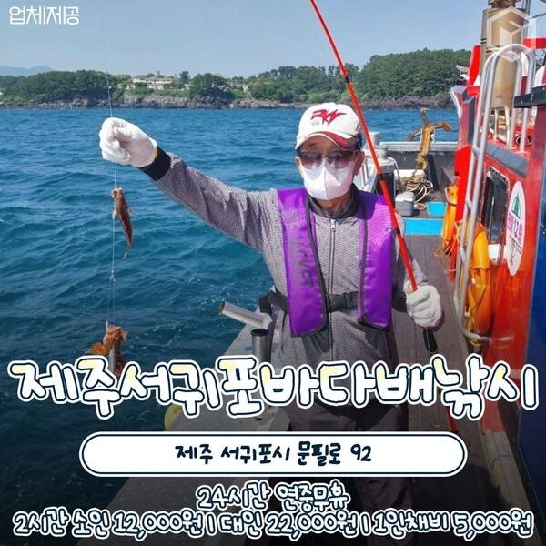 다양한 어종을 낚아 올려볼 수 있는 제주도 바다낚시 체험 서귀포바다배낚시체험입니다. 한치와 갈치, 야간 낚시 체험 등 다양한 낚시 체험이 마련되어 있는데요. 새섬을 감상하며 출항한 선상이 낚시 포인트에 도착하면, 함께 탑승한 체험객들이 빠른 시간에 고기를 낚아올릴만큼 고기가 풍부한 스팟이라고 합니다.
