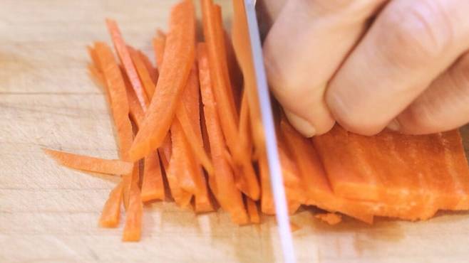 당근 35g은 채 썰어 준비하세요. 대파는 송송 썰어 2T 준비하세요. 풋고추 1개는 씨를 제거한 후 당근과 같은 크기로 썰어 놓으세요. 쪽파 3~4뿌리도 같은 크기로 썰어 주세요.
