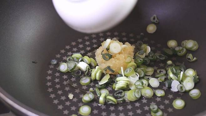 첫 번째 핵심 포인트입니다. 웍팬에 식용유를 두르고 대파와 마늘 1T을 중불에서 1분 정도 볶아 향을 내주세요.