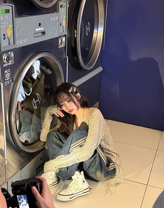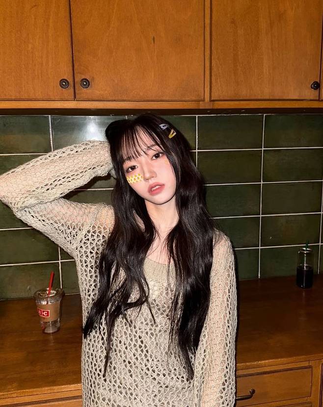 그녀가 선택한 아이템은 와이드한 짜임의 베이지 컬러 니트 톱. 시스루 텍스처가 자연스럽게 이너웨어와 어우러지며 은근한 섹시미와 동시에 청순한 무드를 자아낸다. 여기에 웨이브 헤어와 이마 위로 자연스럽게 떨어지는 시스루 뱅 앞머리가 분위기를 배가시킨다. 포인트로는 컬러풀한 미니 헤어핀과 볼터치 패치가 사용되어, 전체적으로 Y2K 감성과 귀여움을 동시에 연출한다.