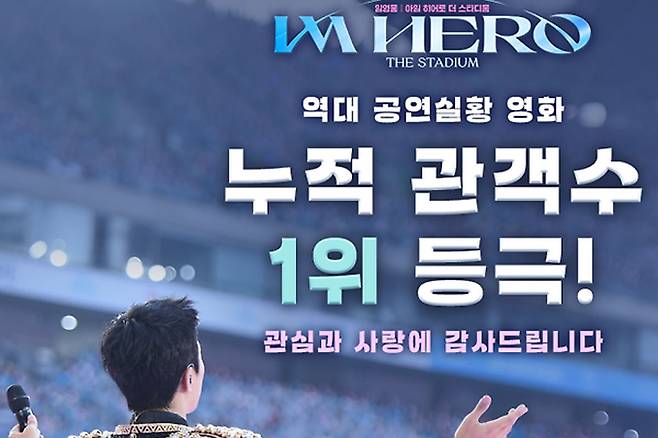 업계에 따르면 ‘임영웅│아임 히어로 더 스타디움’은 지난 22일 누적 관객 수 35만 명 돌파하며 역대 공연 실황 영화 누적 스코어 1위에 오른 것으로 알려졌다. 해당 누적 스코어는 임영웅의 전국 투어 앙코르 콘서트를 담았던 전작 ‘아임 히어로 더 파이널’보다 약 10만 명 더 높은 기록으로 확인됐다.