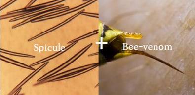 벌침을 화장품으로 구현하는 방법을 찾기 위해 약물전달시스템(DDS) 연구를 시작했다. “요즘 유행하는 미세침(스피큘)이 들어간 화장품에 주목했습니다. 스피큘은 속이 빈 다공성 구조입니다. 스피큘의 빈공간에 봉독을 합침하면 두피에 봉독을 효과적으로 투입할 수 있겠다고 판단했습니다. 피부과의 MTS 치료를 떠올리면 됩니다. 피부에 적당한 자극을 줘서 혈액순환을 촉진시킨 뒤 앰플을 발라 흡수량을 극대화하는 전략이죠. 앰플 1병당 7만개 정도의 스피큘을 함유하고 있습니다.”
