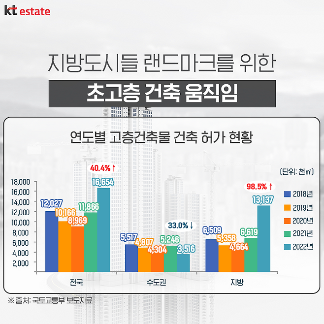 국토교통부가 지난 3월 2일 발표한 ‘2022년 용도별 건축물 현황 및 인허가 추이 현황’ 자료에 따르면, 2022년도의 30층 이상 고층 건축물의 건축 허가 면적은 전년 대비 40.4%가 증가한 것으로 나타났습니다.