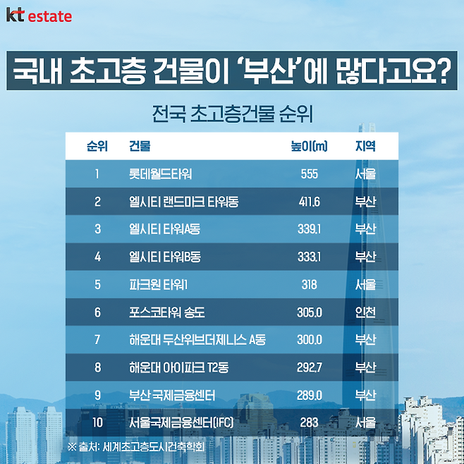 세계초고층도시건축학회 자료에 따르면, 초고층 건축물 상위 10곳 중 3곳이 서울에, 1곳이 인천에 있으며 나머지 6곳은 모두 ‘부산’에 있는 것으로 나타났습니다.