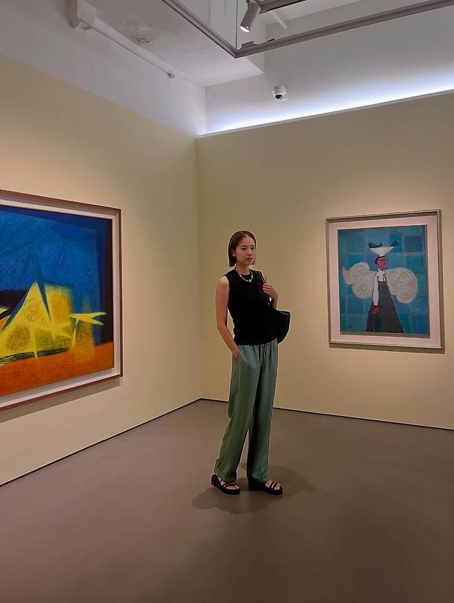 최근 공개된 사진 속 조윤희는 몸에 붙는 심플한 블랙 민소매 톱에 톤 다운된 세련된 그린 컬러의 와이드 팬츠를 매치했다.