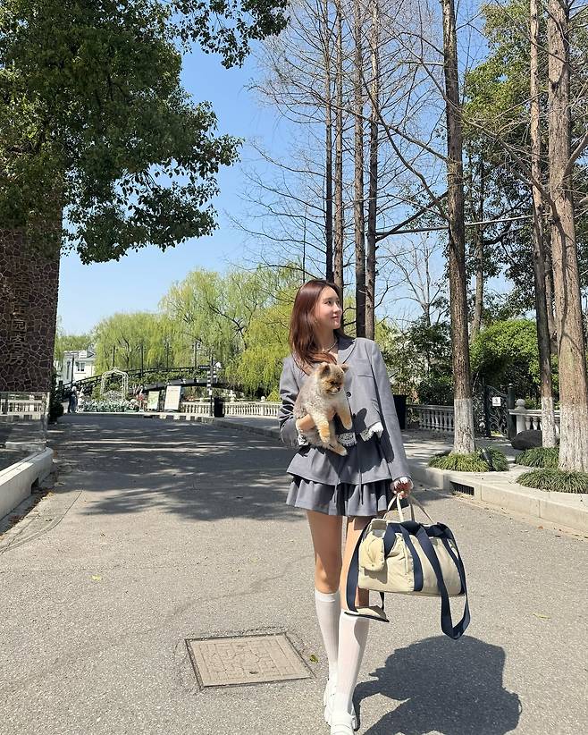 세 번째 사진에서는 이다해가 또 다른 스쿨룩을 선보였다. 회색 재킷과 플리츠 스커트를 활용한 코디는 단정하면서도 편안한 느낌을 강조한다. 화이트 니삭스와 운동화를 매치하여 활동성을 높였으며, 크림색 가방은 캐주얼한 분위기를 더했다. 손에 들고 있는 강아지는 자연스러운 연출로 따뜻함을 더한다.