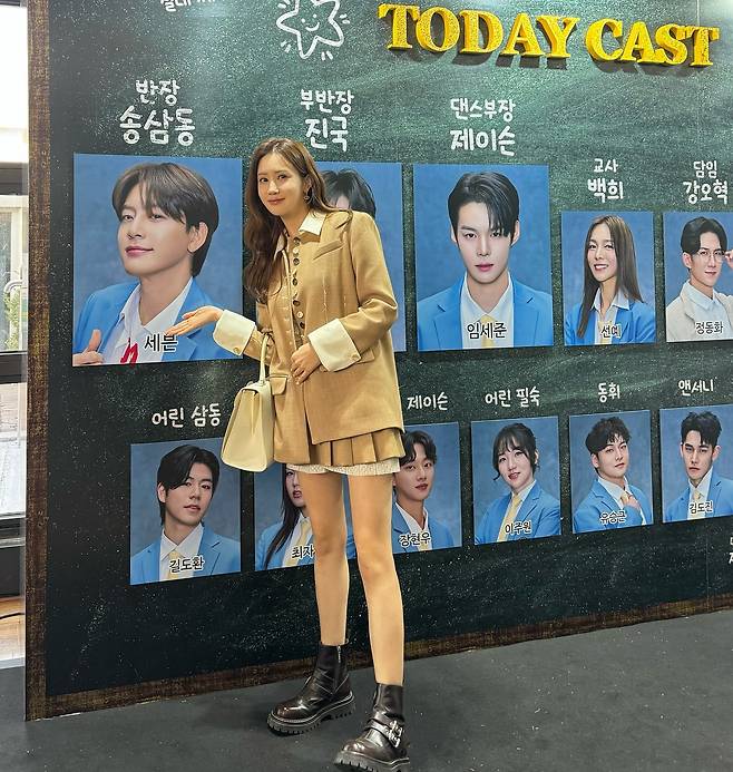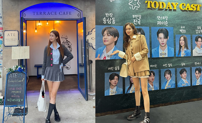 두 번째 사진에서 이다해는 세련된 스쿨룩을 연출했다. 밝은 파란색 셔츠와 짧은 플리츠 스커트를 매치하여 발랄하면서도 클래식한 분위기를 자아냈다. 여기에 회색 카디건과 핑크 버튼으로 포인트를 주며 스타일에 생기를 더했다. 니삭스와 블랙 로퍼는 전체적인 룩을 차분하게 완성하며, 화이트 토트백으로 실용성과 패션을 동시에 잡았다.