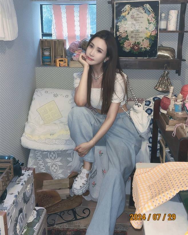 첫 번째 사진에서는 이다해가 빈티지한 스타일을 보여준다. 자수 디테일이 돋보이는 넉넉한 데님 팬츠와 크롭 티셔츠를 매치하여 편안하면서도 여성스러운 무드를 연출했다. 화이트 샌들은 여름철 캐주얼 룩에 적합하며, 골드 액세서리와 화이트 숄더백은 룩에 고급스러움을 더한다.
