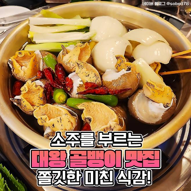 크기도 엄청나서 순간 소라가 잘못 왔나 싶은 정도랍니다! 각종 야채와 청양고추도 들어가 있어 매콤하고 칼칼한 국물에 물인지 술인지 모르고 마시게 되는 골뱅이 신사.