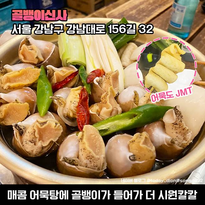 두 번째로 소개해 드릴 곳은 웨이팅은 기본인 신사역 맛집 원조 골뱅이 전문점이에요. 추천 메뉴인 백 골뱅이를 주문하면 골뱅이와 오뎅이 가득 들어있는 골뱅이탕이 배달된답니다.