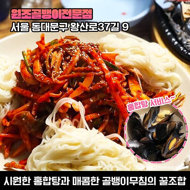 원조 골뱅이 전문점의 명불허전 시그니처 골뱅이무침. 쫄깃한 국수 소면에 매콤한 골뱅이 무침 먹으면 소주는 무한대 추가죠. 홍합탕 국물에 골뱅이무침 번갈아 먹다 보면 거대한 한 접시도 뚝딱이랍니다.