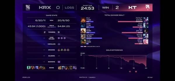 초반부터 KT는 오브젝트와 교전을 모두 챙기며 격차를 벌렸다. 16분 만에 5000골드 이상 앞섰고, 바론 등장 시점엔 이미 승부의 추가 기울어 있었다. DRX가 포위로 반격을 노렸지만 오히려 각개격파를 당했고, KT는 바론과 드래곤 영혼까지 독식했다.