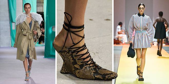 지난 시즌에는 ‘발레 코어’ 트렌드로 인해 발레리나 슈즈가 주를 이루었다면 이번 시즌에는 레이스업 디테일에 주목해 보세요. 끈을 활용해 발을 조이는 스타일로, 어떤 방식으로 끈을 묶느냐에 따라 다양한 스타일링을 연출할 수 있어 높은 활용도를 자랑합니다. 팬츠보다는 원피스나 스커트와 함께 매치한다면 다리가 길어 보이는 효과도 줄 수 있습니다. 탈부착 할 수 있는 끈이라면 다른 컬러의 스페어 끈을 준비해 룩에 따른 다채로운 스타일링을 완성해 보세요.