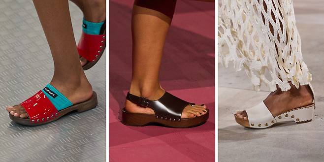 유럽 중세 시대, 진흙탕이나 거친 지면에서 노동자의 발을 보호하기 위해 통나무로 제작된 것으로부터 시작된 클로그. 1970년대 히피, 보헤미안 문화의 영향으로 재조명되기 시작해 현대에 이르러 가장 스타일리시한 슈즈 중 하나입니다. 발등을 덮는 소재와의 연결을 위해 볼드한 스터드로 고정한 것이 특징인데요. 이번 시즌 미우미우와 에르메스는 고급 레더를 활용한 믹스매치를 선보여 고급스러운 무드를 배가했습니다.