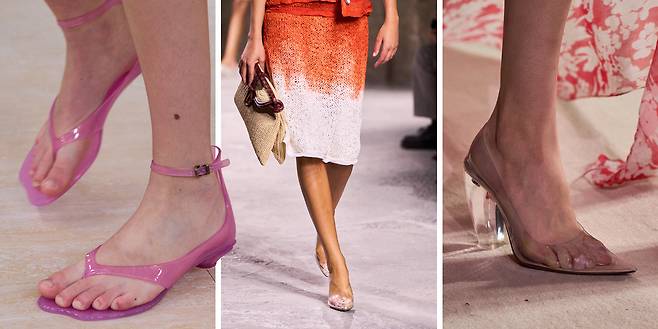 위트 있고 장난기 어린 분위기로 어린 아이들부터 성인들의 마음까지 사로잡은 젤리 슈즈가 올여름 보다 페미닌한 스타일로 변모했습니다. 끌로에는 사랑스러운 핑크 컬러의 PVC 소재를 사용해 로맨틱한 무드를 더하고, 낮은 키튼 힐로 편안함까지 놓치지 않았습니다. 보테가 베네타와 빅토리아 베컴은 보디 전체가 투명한 펌프스 스타일로 선보여 시원해 보이는 효과와 여성스러운 매력을 동시에 자아냅니다.
