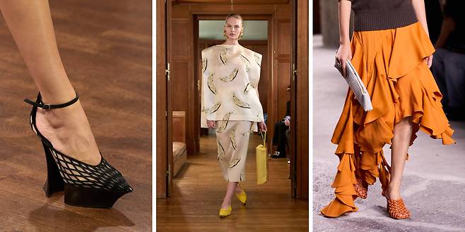 말 그대로 ‘그물망’ 구조를 형상화한 슈즈는 특히 여름철에 자주 선보이는 스타일로, 기존에는 백이나 드레스, 수영복에서 줄곧 볼 수 있었는데 최근에는 슈즈로 그 영역을 넓혀가고 있습니다. 소재 특성상 통기성이 좋고 유니크한 디자인으로 룩에 포인트를 주기에 제격이죠. 이번 시즌에는 컬러를 활용한 톤온톤 스타일링이 관전 포인트인데요. 자크뮈스는 룩의 프린트와 가방, 신발의 컬러의 톤을 동일하게 맞추어 감각적인 룩을 연출했고, 보테가 베네타도 마찬가지로 스커트와 슈즈의 컬러 플레이로 보는 재미를 더했습니다.