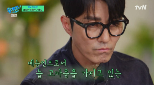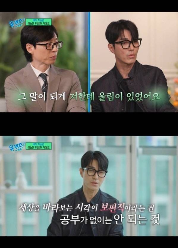 차승원은 2024년 8월 tvN 예능 프로그램 '유 퀴즈 온 더 블럭'(이하 '유퀴즈')에 게스트로 출연했습니다. 이날 차승원은 과거 유재석과 함께 MBC '무한도전' 촬영 당시를 떠올리며 "'무도' 끝나고 똑같은 얘기를 했다. 예능을 사랑해 주셔서 감사하다고 하는데 울림이 있었다. 정말 자기 일에 대한 소중, 감사함이 넘치는 사람이더라. 그 이후부터 예능을 대하는 내 태도가 많이 바뀌었다"라고 말했습니다.