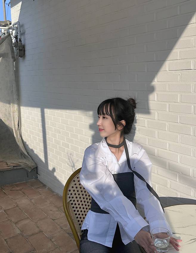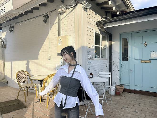 햇빛이 잘 드는 화이트톤의 미니멀한 카페나 갤러리와 특히 잘 어울리는 룩이에요.
