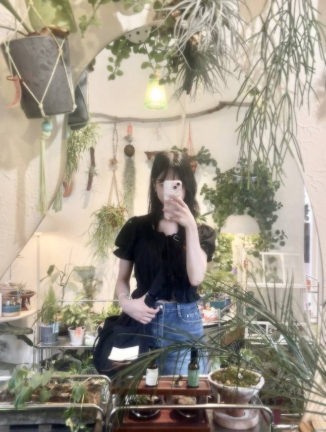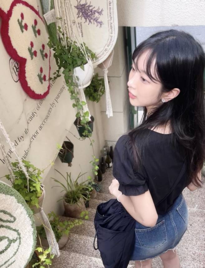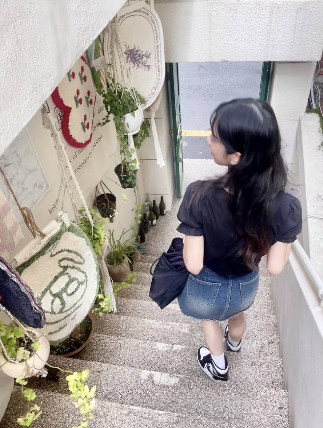 하의는 심플한 중청 데님 스커트를 선택해서 상의의 화려함을 정리해줬고,