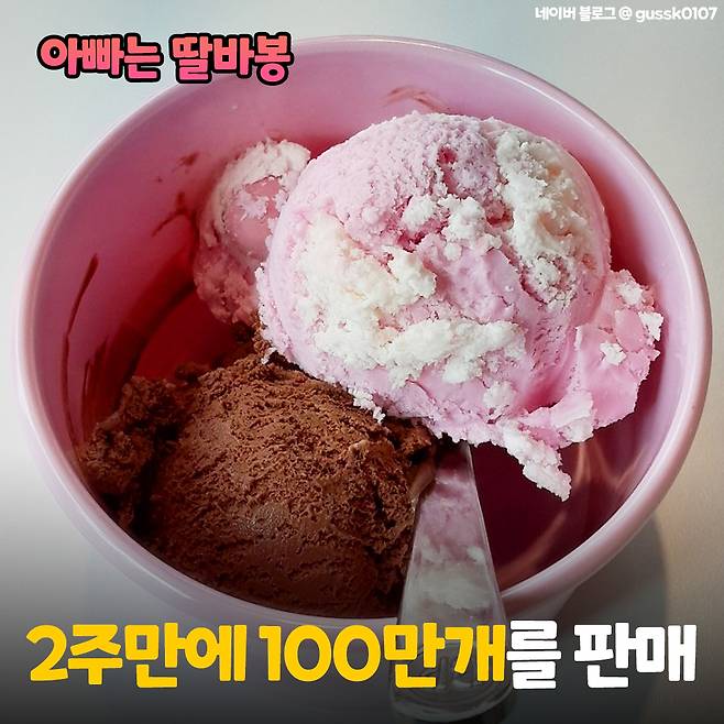 두 번째로 공개된 재출시 메뉴는 <아빠는 딸바봉>이었어요! 배라 소비자가 직접 작명한 맛이고, 2019년 10월에 출시된 지 2주 만에 판매량 100만 개를 돌파한 슈스 중의 슈스라고 해요!