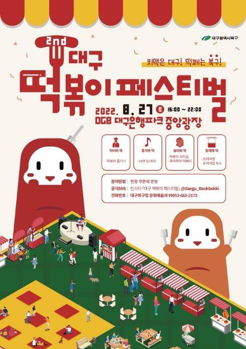 누구나 학창시절 학교 앞 분식집에 삼삼오오 모여 떡볶이를 먹은 추억이 있을 테다. 남녀노소 좋아하는 매콤달콤 떡볶이가 축제의 주인공이 됐다. 27일 대구 북구 DGB 대구은행파크 중앙광장에서 ‘대구 떡볶이 페스티벌’이 열린다. 이번 행사에는 북구에서 소문난 떡볶이 맛집 8곳이 참가해 부스를 운영한다. 각 식당만의 비법으로 맛을 낸 개성 강한 떡볶이를 한자리에서 맛볼 수 있다. 옛 떡볶이집 정취를 고스란히 옮긴 DJ박스도 선다. 종이에 신청곡을 적어 내면 그 자리에서 바로 음악을 틀어준다. 관람객이 직접 참여해 자신만의 요리법을 공유하는 ‘나만의 떡볶이 공작소’도 눈길을 끈다. 참가비는 없지만 떡볶이 시식비는 별도로 내야 한다. 행사장에 가기 전 공식 인스타그램 게시글을 자신의 SNS에 공유하면 할인쿠폰을 받을 수 있다.