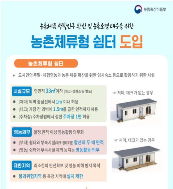 또 농식품부는 위급상황 때 신속하게 대응하고자 소방 활동이 가능한 도로(주민이 관습적으로 사용하는 사실상 통로 포함)에 접한 농지에만 농촌 체류형 쉼터를 세울 수 있게 했다. 소화기 비치와 단독경보형 감지기 설치도 의무화했다. 농촌 체류형 쉼터를 만들고자 하는 사람은 가설건축물 축조신고서를 작성한 뒤 위치도 등 관련 서류를 첨부해 시·군 허가부서에 제출하면 된다. 이후에는 농지대장 변경 사항을 등재해야 한다.