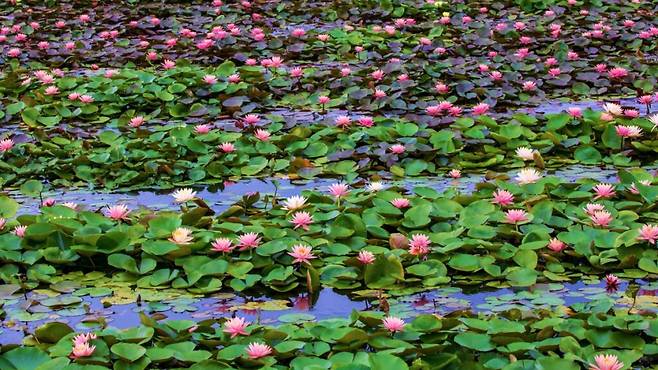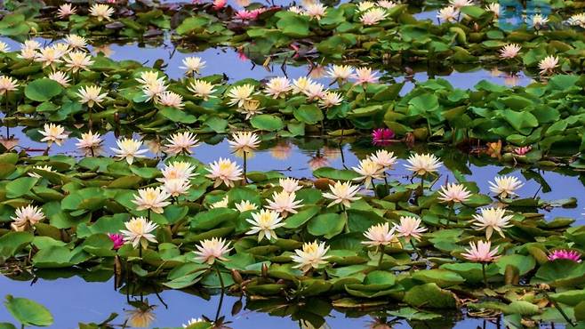 바람에 흔들리지 않고 물결 위에서 천천히 퍼지는 그 형태는 보는 사람의 마음까지 잠잠하게 가라앉힌다. 이런 수련이 여름이면 절정을 이루는 호수가 있다.