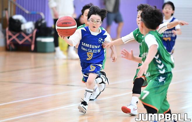 11일 내수생활체육공원에서 열린 ‘2024 충북 청주 농구 i-League(이하 i리그)’ U8부 아산삼성과 화도삼성의 맞대결. 화도삼성에 고글을 쓰고 열심히 코트를 누비던 한 소년이 있었다. 바로 김승찬(8)이다. 김승찬은 열정적인 플레이로 팀 승리에 힘을 보탰다.