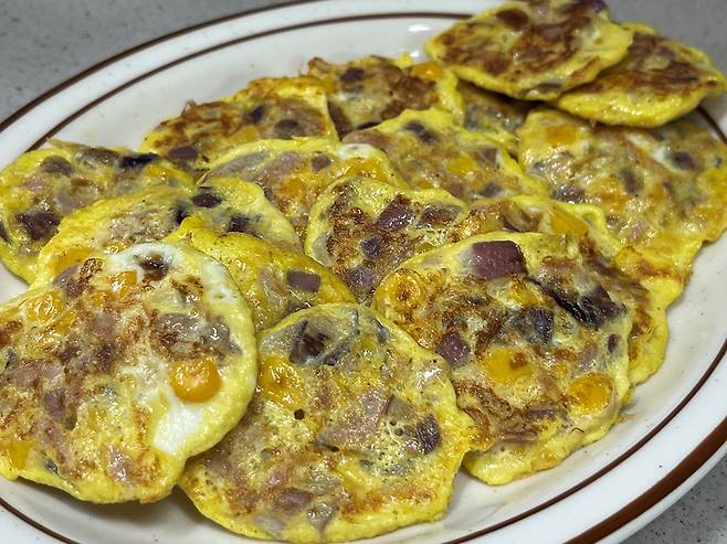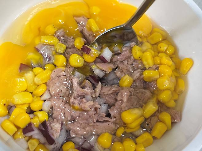 참치, 양파, 옥수수 그리고 계란만 들어갔을 뿐인데 웬만한 전 요리 부럽지 않습니다. 옥수수가 들어가 식감도 좋고, 참치의 고소함까지 어우러져 정말 맛있습니다.