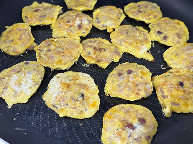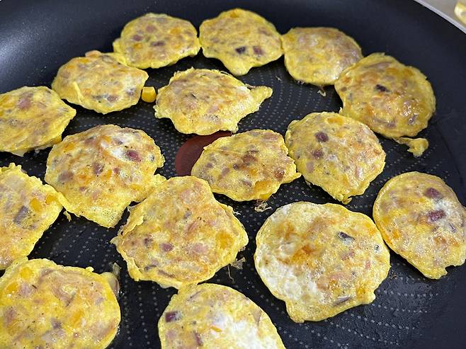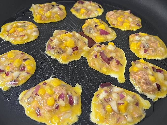 참치, 옥수수 등은 푹 익힐 필요는 없는 재료입니다. 대략 계란물이 익고 양파가 살짝 투명해질 때쯤 뒤집어서 반대편도 익혀 주세요.